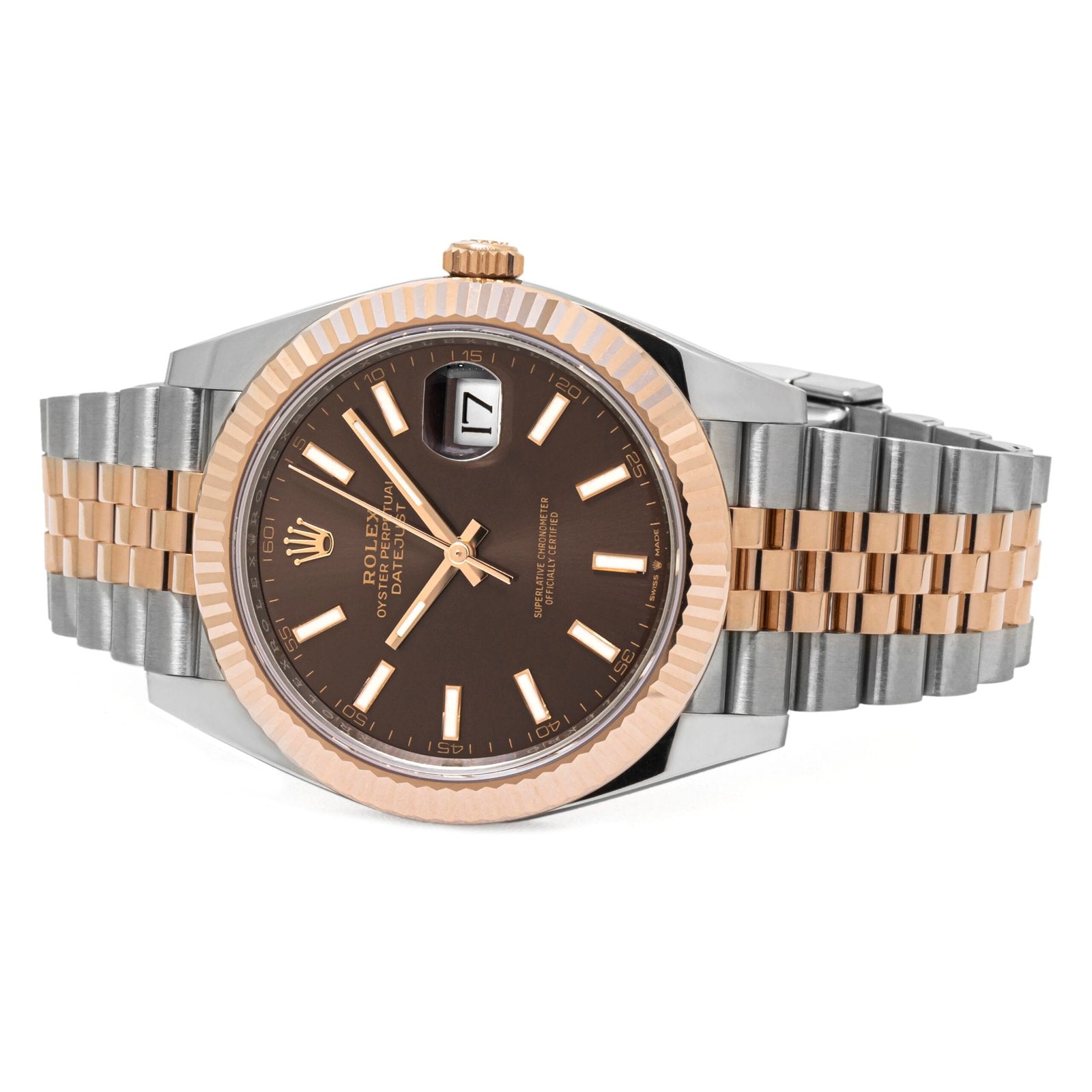 Overview: The Rolex 126331 Steel & Rose Gold Jubilee Datejust 41 with a Chocolate Dial represents a harmonious blend of timeless elegance and modern sophistication. With a 41mm case, this exquisite timepiece seamlessly marries the durability of steel with the opulence of rose gold, while the chocolate diamond dial adds a touch of luxury.